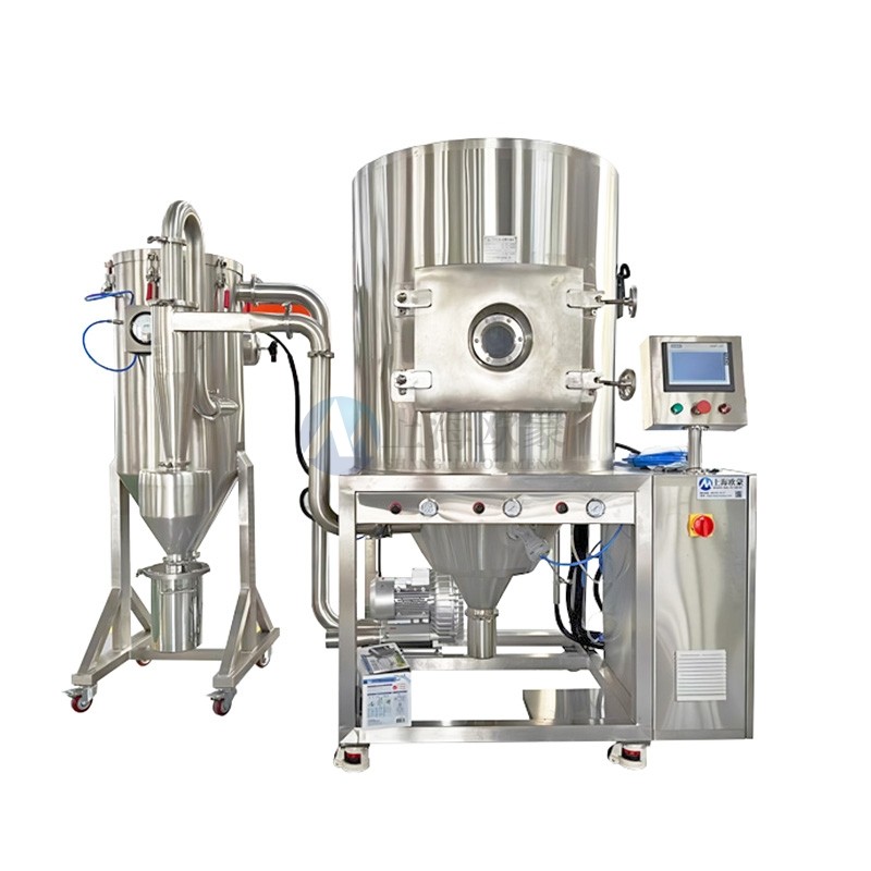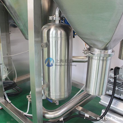 关于新利18App为开式循环,并流式,离心式雾化。干燥介质空气经过初、中效空气过滤器过滤后根据操作指令由鼓风机吸取再经加热器加热通过高效过滤器的热风分配器进入喷雾干燥主塔。液体物料根据操作指令经过蠕动泵,进入高速旋转的离心喷头,在离心力作用下被分散成小雾滴。在喷雾干燥主塔内,小雾滴与热风在充分接触,沿其特定路径进行热交换后被干燥成为产品,然后通过旋风分离器实现分离,固体物料被收集,气体介质再经过过滤后被排出。整套喷雾系统易清洁、无死角,符合GMP要求。